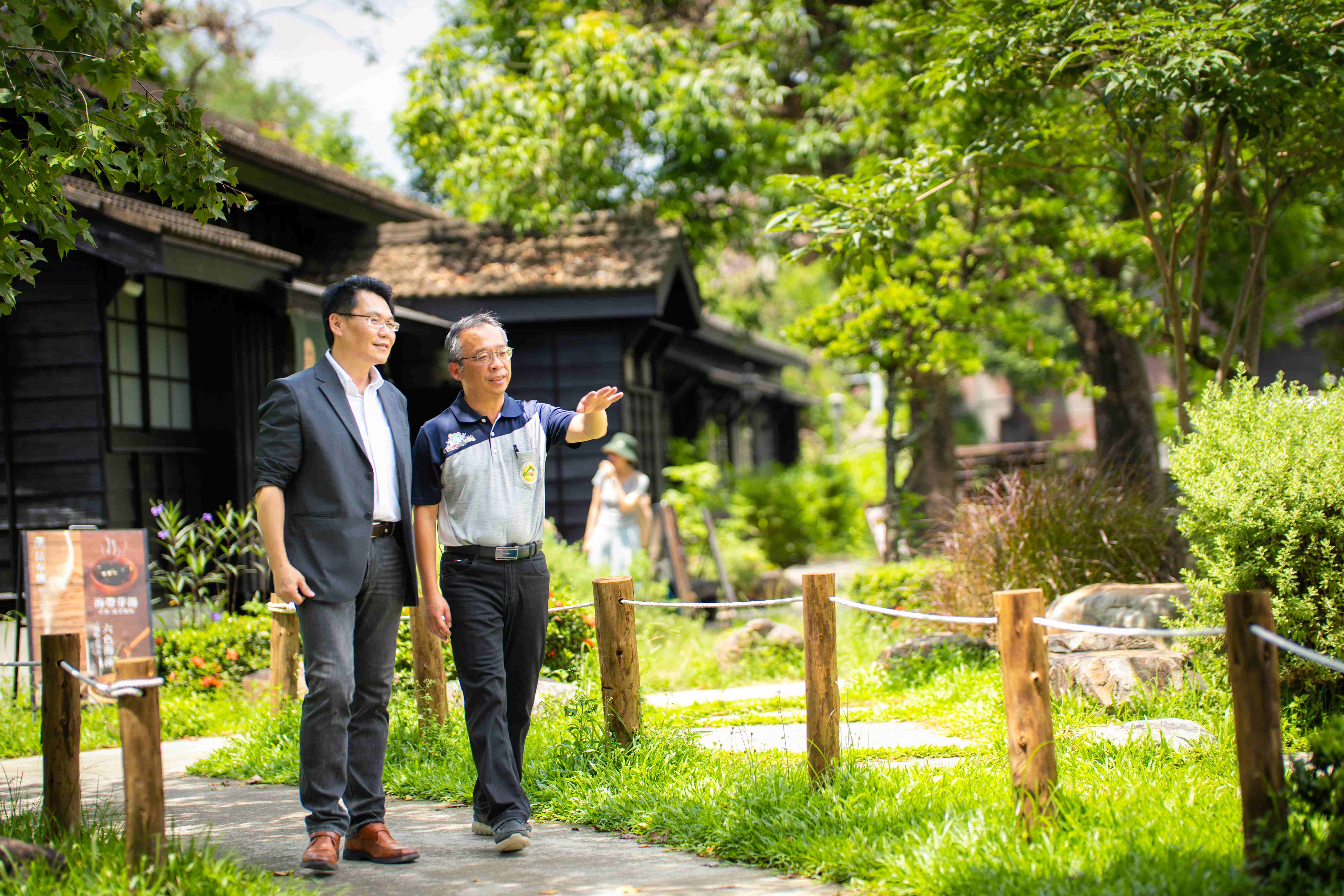 雷門執行長賴良賓(左)與林鐵副處長周恆凱(右)在檜意森活村內交流數位治理構想。
